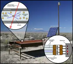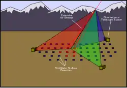 The Telescope Array observatory is a hybrid detector system consisting of both an array of 507 scintillation surface detectors (SD) which measure the distribution of charged particles at the Earth's surface, and three fluorescence stations which observe the night sky above the SD array.[2] Each fluorescence station is also accompanied by a LIDAR system for atmospheric monitoring.[3] The SD array is much like that of the AGASA group, but covers an area that is nine times larger. The hybrid setup of the Telescope Array project allows for simultaneous observation of both the longitudinal development and the lateral distribution of the air showers. When a cosmic ray passes through the Earth's atmosphere and triggers an air shower, the fluorescence telescopes measure the scintillation light generated as the shower passes through the gas of the atmosphere, while the array of scintillator surface detectors samples the footprint of the shower when it reaches the Earth's surface.