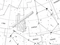 It was one of two constellations created by Maximilian Hell in 1789 to honour the famous English astronomer Sir William Herschel's discovery of the planet Uranus.[1] Named Tubus Hershelli Major by Hell, it was located in the constellation Auriga near the border to Lynx and Gemini and depicted Herschel's 20-ft-long telescope. Its sibling was Tubus Hershelli Minor, which lay between Orion and Taurus. The two telescopes lay near Zeta Tauri, near where the planet Uranus was first spotted.[1]