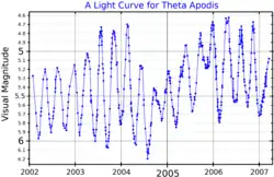 Benjamin Apthorp Gould announced that Theta Apodis is a variable star, in 1879.[12] It is a semiregular pulsating variable and its brightness changes over a range of 0.56 magnitudes with a period of 119[3] days. A longer period of around 1,000 days has also been detected.[11]