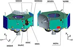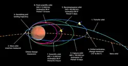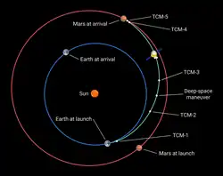 During its cruise to Mars, the spacecraft completed four trajectory correction maneuvers plus an additional maneuver to alter its heliocentric orbital inclination; it also performed self diagnostics on multiple payloads.[50][51] After payload checkouts, the spacecraft began scientific operations with the Mars Energetic Particle Analyzer, mounted on the orbiter, which transmitted initial data back to ground control.[52]
