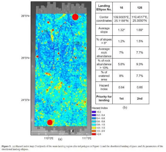 Using the HiRIC mosaics, the selection team conducted various terrain analyses on potential candidate landing ellipses within the primary target region in an iterative manner; these analyses included the determination of the candidate ellipse's average slope, the percentage of slope with an angle greater than 8%, average rock abundance, the percentage of area within the candidate ellipse with a rock abundance greater than 10%, and the percentage of cratered area. A 'hazard index' is then distilled from the analyses for each candidate ellipse. Candidate ellipse 16, with the lowest hazard index, emerged as the primary target (candidate ellipse 128, with the next lowest hazard index, was the backup).[65] See the following figure produced by the landing selection team intended to illustrate the calculation of the hazard indices for candidate ellipses 16 and 128.