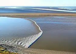 A tidal bore,[1] often simply given as bore in context, is a tidal phenomenon in which the leading edge of the incoming tide forms a wave (or waves) of water that travels up a river or narrow bay, reversing the direction of the river or bay's current. It is a strong tide that pushes up the river, against the current.