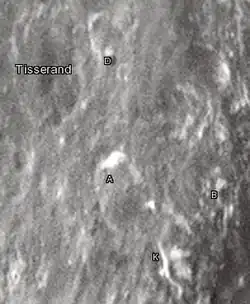 By convention these features are identified on lunar maps by placing the letter on the side of the crater midpoint that is closest to Tisserand.