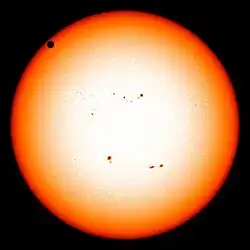 - ↑ The black drop effect distorts the image of Venus at the observed edge of the Sun. The effect is caused by turbulence in the Earth's atmosphere, imperfections in the viewing apparatus, or the extreme change in brightness at the edge of the Sun.