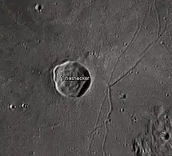 Triesnecker is a prominent lunar impact crater that is located in the Sinus Medii, near the central part of the Moon's near side. Its diameter is 25 km. It was named after Austrian astronomer Franz de Paula Triesnecker.[1] It is located to the north-northwest of the crater Rhaeticus, and to the east-southeast of the flooded Murchison.