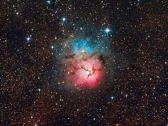 The Trifid Nebula (catalogued as Messier 20 or M20 and as NGC 6514) is an H II region in the north-west of Sagittarius in a star-forming region in the Milky Way's Scutum–Centaurus Arm.[3] It was discovered by Charles Messier on June 5, 1764.[4] Its name means 'three-lobe'. The object is an unusual combination of an open cluster of stars, an emission nebula (the relatively dense, reddish-pink portion), a reflection nebula (the mainly NNE blue portion), and a dark nebula (the apparent 'gaps' in the former that cause the trifurcated appearance, also designated Barnard 85). Viewed through a small telescope, the Trifid Nebula is a bright and peculiar object, and is thus a perennial favorite of amateur astronomers.[5]