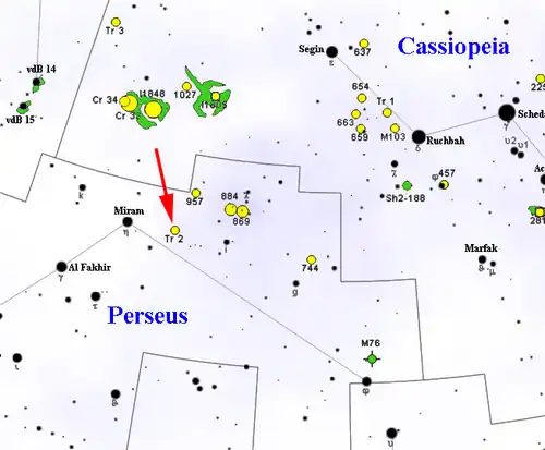 Trumpler 2 is an open cluster located in the constellation Perseus. It is approximately 2000 light-years from Earth, placing its position within the Perseus Arm of the Milky Way Galaxy. Although at this large distance, it can be seen with the naked eye, at magnitude 6.[1]