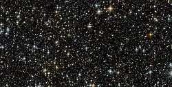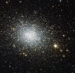 The second-brightest globular cluster in the sky after Omega Centauri, 47 Tucanae (NGC 104) lies just west of the Small Magellanic Cloud. Only 14,700 light-years distant from Earth, it is thought to be around 12 billion years old.[13] Mostly composed of old, yellow stars, it does possess a contingent of blue stragglers, hot stars that are hypothesized to form from binary star mergers.[48] 47 Tucanae has an apparent magnitude of 3.9, meaning that it is visible to the naked eye; it is a Shapley class III cluster, which means that it has a clearly defined nucleus. Near to 47 Tucana on the sky, and often seen in wide-field photographs showing it, are two much more distant globular clusters associated with the SMC: NGC 121, 10 arcminutes away from the bigger cluster's edge, and Lindsay 8.[49]