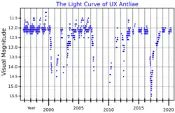 UX Antliae is a post-AGB and R Coronae Borealis variable star that has a base apparent magnitude of around 11.85, with irregular dimmings down to below magnitude 18.0.[8]