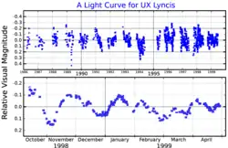 ![]() A visual band light curve for UX Lyncis. The top panel shows the variation over a period of years, and the lower plot shows the variation over a period of months. Adapted from Percy and Wilson (2001)[1] | |