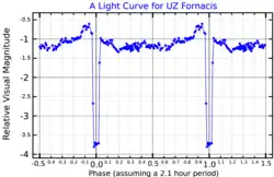 The brightness of UZ Fornacis varies rapidly and somewhat unpredictably. The two stars in the system eclipse each other regularly. The eclipses last for about 380 s, with the initial drop in brightness and return to maximum brightness each taking about 3 s. The eclipse light curves do not all have the same shape, some being more or less flat-bottomed while others show a smooth variation in brightness, and some are asymmetrical. The times of the eclipses vary, possibly due to substellar companions.[4] Outside of the eclipses, the brightness varies during the orbit depending on the visibility of an accretion spot on the white dwarf.[14]