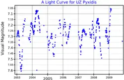 There were hints that the star is variable as early as the late 19th century,[15] and its variability was firmly estabilished by Olin J. Eggen in 1972.[16][11] The variable star designation UZ Pyxidis was assigned in 1978.[17] UZ Pyxidis is classified as a semiregular variable with a dominant period of 159.6 days. It varies in brightness between magnitude 6.99 and 7.63.[3]