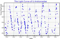 U Andromedae is the variable star designation of this star. Its brightness varies by several magnitudes with a mean period of 347.7 d, although the exact length of each cycle is somewhat variable. Similarly, the magnitude of each maximum and minimum varies. The mean apparent magnitude is 11.6, with a mean maximum magnitude of 9.9.[6] The brightest recorded maxima are at magnitude 9.0, and the faintest minima at magnitude 15.0.[3] The rise to maximum brightness is faster than the fall to minimum, taking on average 40% of the period.[7]