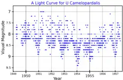 In 1891, Williamina Fleming announced that the star (then known as DM +62°.596) is a variable star, based on 13 photographs taken in 1890 and 1891.[13] It was listed with its variable star designation, U Camelopardalis, in Annie Jump Cannon's 1907 work Second Catalog of Variable Stars.[14] U Camelopardalis is a carbon star. These types of stars have greater levels of carbon in their atmospheres than oxygen, which means they form carbon compounds that make the star appear strikingly red. U Camelopardalis is nearly 4 magnitudes fainter at blue wavelengths than in the centre of the visual range. In the infrared K band it has an apparent magnitude of 0.37.[15] Its brightness varies without a dominant period and it is classified as semi-regular, although a period of 400 days has been published.[15] In the V photometric band the brightness varies by around half a magnitude,[16] but the amplitude is nearly two magnitudes at blue wavelengths.[4] The maximum visual magnitude has been given as 7.2.[7]