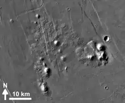 Ulysses Colles is an official name for conical edifices associated with flows in Ulysses Fossae in the Tharsis quadrangle of Mars.[1] These conical edifices form small volcanic field which were interpreted as result of explosive eruptions on Mars where martian equivalents to terrestrial pyroclastic cones,[2] cinder cones respectively, exist.[3] This field is situated north of the shield volcanoes Biblis Patera and Ulysses Patera and it is superposed on an old, elevated window of fractured crust of Ulysses Fossae, probably of early Hesperian age,[4] which survived flooding by younger lava flows associated with plain-style volcanism in Tharsis.[5][6]