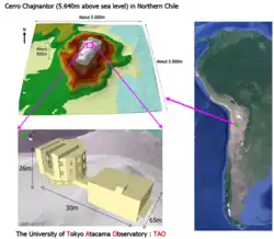 The University of Tokyo Atacama Observatory (TAO) is an astronomical observatory located on the summit of Cerro Chajnantor, at an altitude of 5,640 m (18,500 ft) within a lava dome in the Atacama Desert of northern Chile.[1] The site is located less than 5 km (3.1 mi) north-northeast of the Llano de Chajnantor Observatory, where the Atacama Large Millimeter Array (ALMA) is located, but is over 580 m (1,900 ft) higher in elevation. It is also 28 m (92 ft) higher than the site proposed for the Fred Young Submillimeter Telescope on the same peak. The observatory is operated by the Graduate School of Science and Faculty of Science, University of Tokyo. Operation began in 2024.[2]