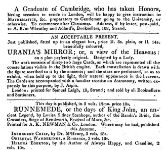 - 1 2 3 4 5 "Advertisement". Monthly Critical Gazette. London: Sherwood, Jones, and Co. December 1824. p. 578. See also File:Advertisement for Urania's Mirror.png.