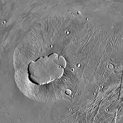 Uranius Mons,[1] formerly Uranius Patera, is a volcano on Mars located in the Tharsis quadrangle, named after a classical albedo feature. The name "Uranius Patera" now refers only to the volcano's central caldera.[2] It is 4,853 metres (15,922 ft) high[3] and has shallow slopes. It belongs to the Uranius group of volcanoes in the Tharsis area. The sides of Uranius Mons consist of radial lava flows; the large caldera (90×65 km) is elongated in the southwestern direction. The surrounding plains are younger and part of the Tharsis Montes Formation of the Amazonian epoch.[4]