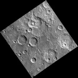 The large crater Alver lies in southern Utaridi Planitia. The Rembrandt basin lies to the north of it.