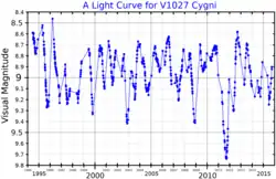 When V1027 Cygni was first noticed as a variable star, it was thought to be an irregular variable, dimming and brightening erratically with no discernible period. However, in 2009, a small-amplitude period of 237 days was observed in long-term photometry of the star.[1]
