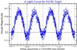 V1191 Cygni is a W-type W UMa variable,[8] meaning that the primary eclipse occurs when the less-massive component is eclipsed by the larger, more massive component, although the masses are unusually different for such a system.[14] The current period is very short for a system of its spectral type, suggesting that the stars are relatively small for their mass and age,[14] which is likely around 3.85 billion years.[12] The pair's orbital period is increasing at a rate of over 4×10−7 days per year, one of the fastest known rates among contact binary systems,[8] likely due to the high rate of mass transfer. In addition to the period increase, there is cyclic period change of 0.023 days over 26.7 years, caused by either a third body with a mass of 0.77 solar masses or magnetic activity cycles. The mass transfer will likely eventually cause the system to evolve into a single star with a very high rotation rate.[13]