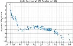 V1370 Aquilae faded rapidly after its discovery, and it had dimmed by three magnitudes in 13 days, making it a "fast" nova in the classification scheme of Cecilia Payne-Gaposchkin.[6][7] The light curve passed through a local minimum 43 days after the nova's discovery. That "dust dip", about 1 magnitude deep, resulted in the light curve being classified as type D.[8][9]