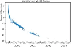 V1494 Aquilae or Nova Aquilae 1999 b was a nova which occurred during 1999 in the constellation Aquila and reached a brightness of magnitude 3.9 on 2 December 1999.[2] making it easily visible to the naked eye.[9] The nova was discovered with 14×100 binoculars by Alfredo Pereira of Cabo da Roca, Portugal at 18:50 UT on 1 December 1999, when it had a visual magnitude of 6.0.[10]