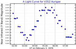 In 1977, Donald W. Kurtz discovered that the star, then called HR 2557, is a variable star.[15] It was given its variable star designation, V352 Aurigae, in 1981.[16] V352 Aurigae is a low amplitude Delta Scuti variable with a period of 4.1 hours,[4] which means the variability is caused by the rotation of the host star in combination with localized regions of activity.[17] The star has 13 times the radius of the Sun and is radiating 242 times the Sun's luminosity from its photosphere at an effective temperature of 6,350 K.[8] It is unusually luminous for a Delta Scuti variable.[18] It is also suspected of being a chemically peculiar star of the Delta Delphini type,[19] although the anomalies are not pronounced.[18]