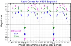 ![]() Light curves for V356 Sagittarii, in three photometric bands. Plotted from data published by Wilson and Woodward (1995).[1] | |