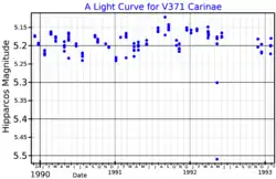 In 1977, Christiaan Sterken announced his discovery that HD 96919 is a variable star.[10] It was given its variable star designation in 1979.[11] V371 Car is an α Cyg variable, erratically pulsating and changing brightness by a few hundredths of a magnitude. Periods of 10–80 days have been identified.[7] It shows unusual emission lines in its spectrum, and high-velocity absorption (HVA) events, temporary spectral features that are thought to indicate localised regions of enhanced mass loss.[12]