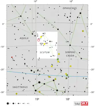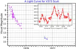V373 Scuti was a nova which appeared in 1975 in the southern constellation of Scutum.[3] It was announced on June 15, 1975 by Paul Wild at the Zimmerwald Observatory, Switzerland.[7] At the time the magnitude was about 7.9.[8] The peak magnitude of 7.1 occurred a month earlier on May 11.[2]
