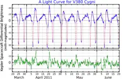 ![]() A light curve for V380 Cygni, adapted from Tkachenko et al. (2012).[1] The blue points in the upper panel show Kepler data. The red line shows a model for the light curve which assumes the two stars have no intrinsic variability. The bottom panel shows the Kepler data with the model subtracted, revealing the intrinsic variability. | |