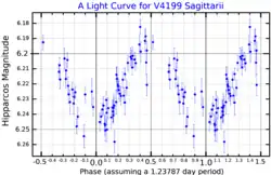 V4199 Sagittarii is a variable star in the southern constellation of Sagittarius.[8] It is a dim star that is just visible to the naked eye with an apparent visual magnitude that varies between 6.22 and 6.28 over a period of 1.23825 days.[9] The star is located at a distance of approximately 689 light years from the Sun based on parallax, but is drifting closer with a radial velocity of roughly −23 km/s.[6] It has an absolute magnitude of −0.63,[3] on average.