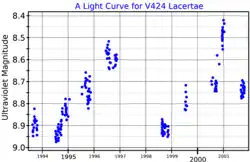 The MK spectral type of V424 Lac has been determined to be K5,[3] but it has also been classified as M0.[6] It was discovered to be slightly variable using analysis of Hipparcos photometry. The total range is less than a tenth of a magnitude.[12] Multiple short periods are detected, as well as slow variations with a period of 1,100 or 1,601 days. Although listed in the General Catalogue of Variable Stars as a slow irregular variable, it has been considered to be either a semiregular variable or long secondary period variable.[11]