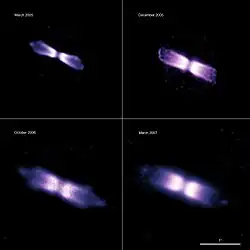 ![]() Expansion of the bipolar shell ejected from V445 Puppis, from 2005 (upper left) to 2007 (lower right) Credit: ESO/P.A. Woudt | |
