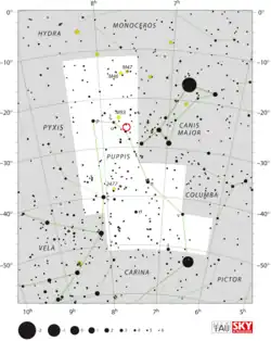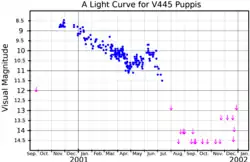 V445 Puppis was a nova in the constellation Puppis. It was discovered by Kazuyoshi Kanatsu of Matsue, Shimane, Japan, who recorded a peak magnitude of on December 18, 2000. The nova was reported by Taichi Kato of Kyoto University in the International Astronomical Union circular 7552, issued on December 30, 2000.[5] The location of this nova coincided with a magnitude 13.1 star that had been photographed in 1967. The proper motion of this star was measured as -4.7 mas/yr in right ascension and +6.4 mas/yr in declination, with a standard error of 4 mas/yr.[6]