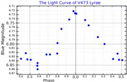 The unusually short period of V473 Lyr is caused by pulsations in the second overtone and the fundamental pulsation period would be three times as long.[6] The amplitude variations have an approximate period of 1,205 days, and there is a secondary modulation with a period of 5,300 days.[10]
