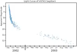 V4743 Sagittarii was a bright nova in the southern constellation of Sagittarius. This event was discovered by K. Haseda and colleagues in September 2002.[1] It peaked at magnitude 5.0[7] on September 20, 2002, then declined rapidly thereafter. It reached a peak temperature of 740,000 K around April 2003 and remained at that level for at least five months, suggesting the white dwarf component has a mass of 1.1–1.2 M☉.[8] The distance to this system is uncertain.[3] Infrared observations indicate a distance of approximately 21 kly (6.3 kpc).[4] A derivation using maximum magnitude rate of decay showed a distance of 12.7 ± 1.0 kly (3.9 ± 0.3 kpc).[8]