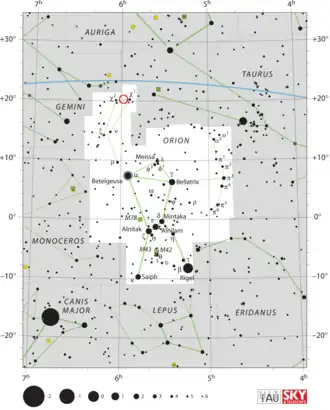 V529 Orionis, also known as Nova Orionis 1678, is a variable star which is usually classified as a nova. It was discovered on 28 March 1678 by Johannes Hevelius, who spotted it while observing a lunar occultation of χ1 Orionis, the star that forms the northernmost tip of Orion's club. Following the occultation of χ1 Orionis, Hevelius observed the occultation of another star by the Moon a few minutes later, which disappeared behind the first quarter Moon at 09:16 and reappeared at 10:29. Those details, combined with modern coordinates for χ1 Orionis, allowed Ashworth to derive coordinates, probably accurate to within a few arc seconds, for the 1678 nova.[3][4]