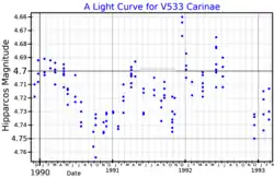 V533 Carinae was one of many small amplitude variable stars detected from an analysis of Hipparcos photometry. It was granted its variable star designation in 1999 as a batch of 2,675 new variables.[15] It is classified as an Alpha Cygni type variable and its brightness varies from magnitude +4.69 to +4.75 as measured on the Hipparcos photometric scale.[5] A period of 1.58499 days and an average visual amplitude of 0.0146 magnitudes are quoted although the variations are not strictly regular.[2]