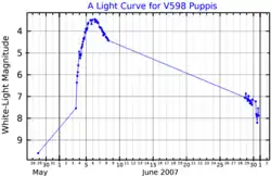 The nova has been officially given the variable star designation V598 Puppis and is one of the brightest in the last decade.[6] Despite its brightness, the nova was apparently missed by amateur and professional astronomers alike until XMM-Newton spotted the unusual X-ray source while turning from one target to another. The All Sky Automated Survey determined that the nova had occurred between June 2nd and 5th, 2007, peaking in brightness on June 5th.[6]