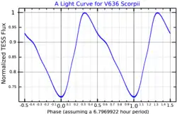 V636 Scorpii is a spectroscopic binary, and the fainter companion is thought to itself consist of two stars. The primary is a luminous yellow star and a δ Cephei variable. The less massive companion orbits every 3.6 years and is apparently a B9.5 main sequence star, but the dynamics of the system suggest that it may actually be a pair of stars is a close orbit.[9]