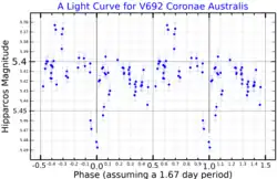 Astronomers Carlos and Mercedes Jaschek along with a colleague listed HD 166596 as a Be star in 1964.[20] However, its status as an Ap star was not observed until 1979 by astronomers N. Vogt and A.M Faundez.[21] A year later, HD 166596 was observed to be variable and it had a period of 1.67 days.[22] In 1981, its variability was confirmed and it was given the variable star designation V692 Coronae Australis—the 692nd variable star in Corona Australis.[23] The star might have a shorter period of 49.8 hours.[7]
