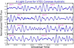 The object was first suspected to be variable in 1990. The variations matched that of δ Scuti variables.[20] Three years later, it was confirmed to be variable and was given the variable star designation V701 Coronae Australis.[21] It ranges from magnitude 5.69 to 5.73[2] within 3.25 hours.[22]