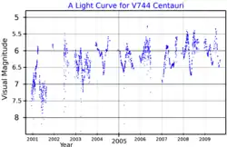 V744 Centauri, is a semi-regular variable pulsating star in the constellation Centaurus. Located 3 degrees north north east of Epsilon Centauri, It ranges from apparent magnitude 5.1 to 6.7 over 90 days.[3] It is unusual in that it is a red star with a high proper motion (greater than 50 milliarcseconds a year).[4] When it is near its maximum brightness, it is visible to the naked eye under good observing conditions.