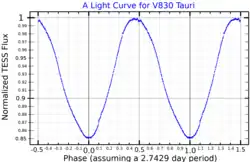 V830 Tauri is a weak-lined T Tauri star, a pre-main sequence star that has a surrounding disc producing emission lines in its spectrum.[4] It is also classified as a BY Draconis variable, cool stars with starspots and chromospheric activity that vary in brightness as they rotate.[3] The variable period of 2.74 days matches the rotation period.[4]