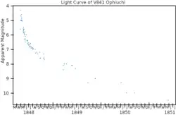 V841 Ophiuchi (Nova Ophiuchi 1848) was a bright nova discovered by John Russell Hind on 27 April 1848. It was the first object of its type discovered since 1670.[5] At the time of its discovery, it had an apparent magnitude of 5.6,[4] but may have reached magnitude 2 at its peak, making it easily visible to the naked eye. Near peak brightness it was described as "bright red" or "scarlet", probably due to Hα line emission.[5] Its brightness is currently varying slowly around magnitude 13.5.[6] The area of the sky surrounding this nova had been examined frequently by astronomers prior to the nova's discovery, because it was near the reported location of "52 Serpentis", a star John Flamsteed had included in his catalogue with erroneous coordinates.[7]