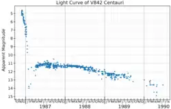 V842 Centauri is considered a moderately fast nova, having faded by 3 magnitudes after 48 days.[3] Near the end of 1986, and early in 1987, its light curve showed a sharp drop in brightness, caused by the formation of dust. This dramatic fading lasted only about 50 days, before the nova brightened by about 2.5 magnitudes.[7] By 2010, it had faded to magnitude 16.5, but was still 2 magnitudes brighter than before the nova eruption.[2]