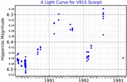 V915 Scorpii is classified as a semiregular variable, with an apparent magnitude that varies between 6.22 and 6.64.[6] Any period associated with the variation is longer than 600 days.[20]