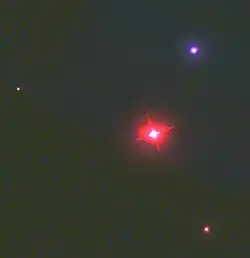 V915 Scorpii has been classified as a triple star. 15" away is the Wolf-Rayet star WR 85, one of the most luminous stars known, but still visually four magnitudes fainter than V915 Scorpii.[14] Component C is a 10th magnitude K class star 17" away.[15] There is also a 14th magnitude star 22" away. Photometry and space motions suggest that only V915 Scorpii and WR 85 lie at the same distance, while the other two stars are foreground objects. Assumptions about the brightness of each star suggest a distance of 2,600 pc, and a projected separation of 0.2 pc.[16]